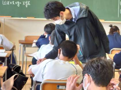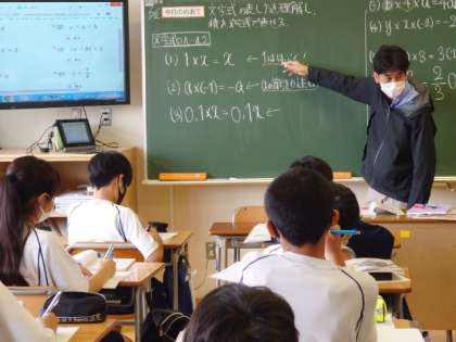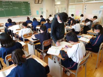 1校時、1年2組数学、田村先生の授業です。今日は文字式のルールを覚えて、式を表します。授業はテンポよく進み生徒も先生の問いに大きな声で答えています。練習問題を出題したあと、生徒の席を周り○つけ、アドバイスをしています。分からないことがその場で解決していきます。