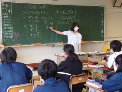 1校時、3年3,4組少人数クラス、小牧先生の授業です。二次方程式を因数分解、