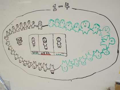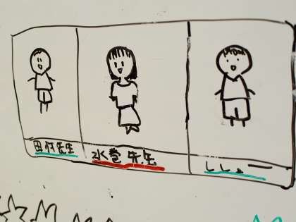 あるクラスのホワイトボードにはこんなイラストが。絵画としての出来ばえはともかく、見ていて実にほのぼのした気持ちになりました。ちなみに‘ししょ−’というのは学校包括支援員さんのことだそうです。