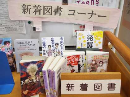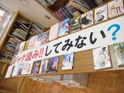 図書室では新着図書コーナーの隣に「ジャケ読み」コーナーも。「ジャケ読みって?」数えきれない出版本をどう選ぶかのひとつに、お気に入りの表紙がついたものを選ぶ、という選び方。司書さんが人気のイラストで飾られた本を集めてみたそうです。