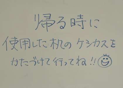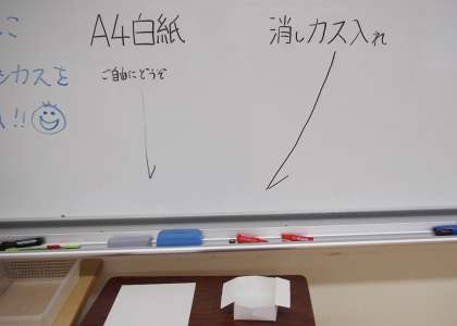 今日もたくさんのフナキボ生たちが自習室を利用しています。あれ?ホワイトボートに書いてある「消しカス」の表示、どこかで見たことが…。あっ、そうか。かつて中学生だったチューター大学生の発案だそうです。「消しカスゼロへの取組み」は永遠の課題ですね。