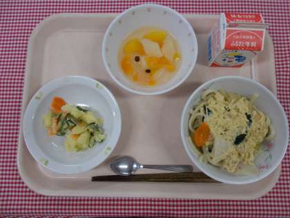 この日の給食は、「卵とじうどん」が主食の献立でした。
