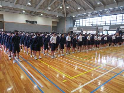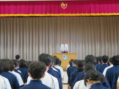 本日、体育館で2・3年生の朝礼が行われました。校長先生からのお話、部活動の表彰が行われ、生徒たちも集中して話を聞いていました。(田村)
