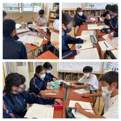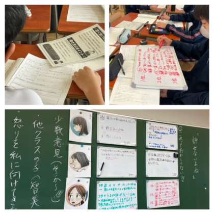 今日の道徳では「許せないよね」という資料から、SNSの情報や人間関係について考えました。班の意見交換では司会カードを使い、いつもより踏み込んでお互いの考えを聞いてみよう、と工夫しました。さまざまな場面や登場人物の立場になり考えましたが、いざ自分がこのような場面に立たされたら…。生きた学びに繋がってくれると良いです.(岩崎)
