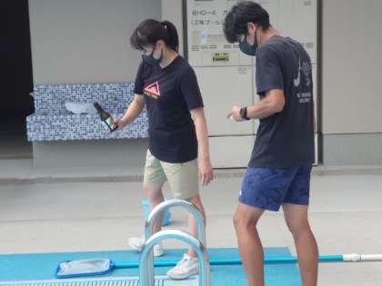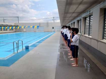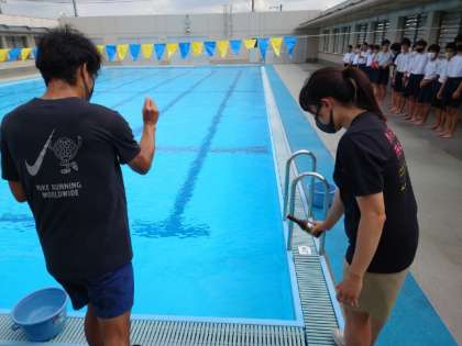水泳の授業、水泳部の活動が1年間無事に行われるように願いを込めて、水泳部の部員立ち会いのもと、日本酒と塩でプールをお清めをしました。