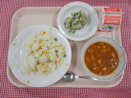 「ピラウ」は、ピラフのような米料理で、「カランガ」という煮込み料理と合わせて食べることが多いようです。今日の給食でも、2つを一緒に食べてみてください。