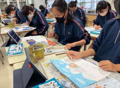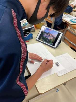 10期生は美術で線遠近法を学び、その中の透視図法を使って夢の家を描く課題に取り組んでいます。タブレットの検索画像も参考にしながら、奥行きを感じられる絵を描いています。夢の世界なので、実際には存在しないようなコンセプトの家ばかりで、個性豊かな家が並ぶのが楽しみです。(岩崎)