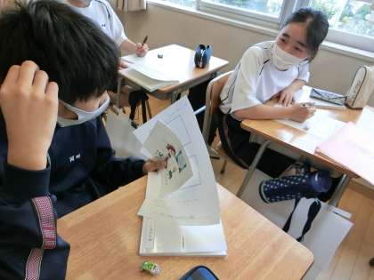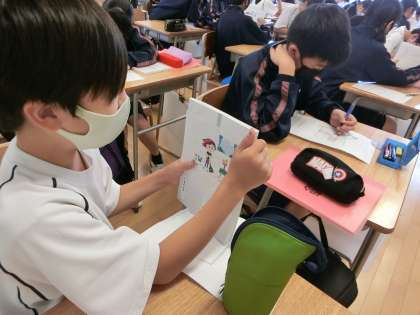 「場面を伝えよう」という単元をやりました。ある絵を、言葉だけで相手に伝えるという活動をしました。教科書にあるポイントを確認したあと、ペアで絵を伝えあいました。