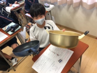 二年生の地理では世界の鉱産資源について学習しました。鍋やフライパン、スチール缶、アルミ缶などを使ってそれぞれの資源の特徴を学びました!