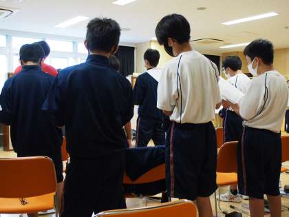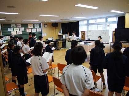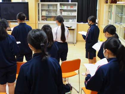 数学の授業の写真を撮っていると、廊下の向こうからかすかに歌声が聞こえてきます。12期生が歌声を響かせていました。この撮影は全て廊下から。そう、音楽室の防音扉を開けているからです。