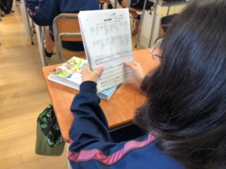 2-5の終学活では合唱コンクールで歌う「桜の季節」の楽譜が配られました。夏休み中に各自で聴いてイメージを膨らませます。