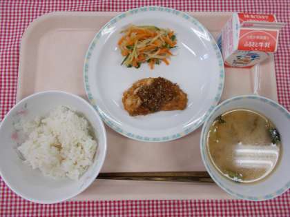 主菜は、「魚の変わりソース」です。今日の魚は、カジキマグロです。カジキマグロに、小麦粉とかたくり粉をまぶしてオーブンで焼きました。そこに、玉ねぎ・しょうゆ・酢・砂糖・油・ごま・唐辛子・マスタードを使って仕上げたタレをかけていただきます。おいしいですよ。しっかりと良く噛んで、残さず食べてくださいね。