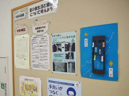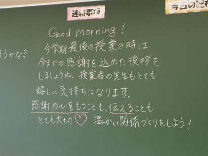 相変わらずはっきりしない空模様の今朝のフナキボ。でも、黒板にはハートフルなメッセージ。給食のコーナーには素敵な紙細工が。。心が落ち着きます。