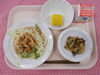 今日の麺は、「冷やし中華」です。中華麺に、油揚げやしいたけなどの具が入ったタレをかけて頂きます。つるつると食べやすい料理ですが、しっかりと噛んで、残さず食べてください。