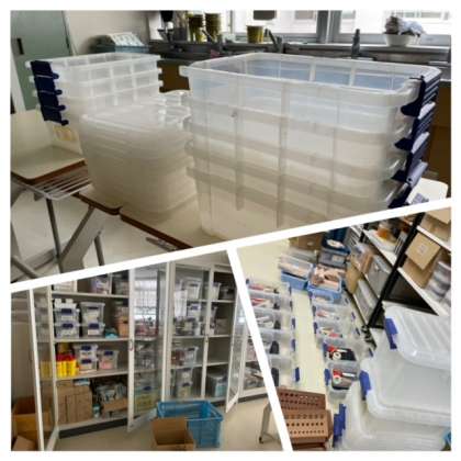 夏休みは二学期準備の前に片付け、片付け。美術室は道具の宝庫。まだ開けたことのない段ボールもちらほら。この箱はなんだろう?と見てみると統合前の美術部の道具や石膏も出てきました。お宝発掘!までとはいかないけれど、使えそうなものも多々発見。処分したり箱をまとめたりして整理しています。ホコリを拭いたり洗ったり、まだまだ広がっている状態なので、もう少し頑張ります!(岩崎)