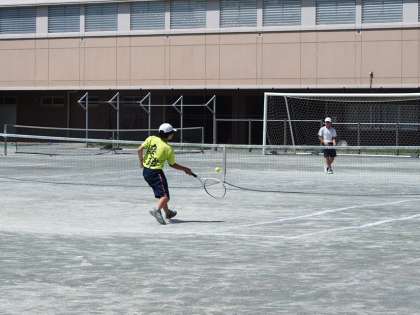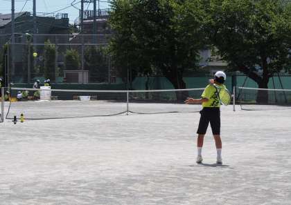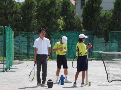 硬式テニス部が夏の陽射しのもと、黄色いボールを追っています。あっ、先生もラケットをもって参加していますね。こういう日の部活は、こまめな水分補給と休憩が欠かせません。