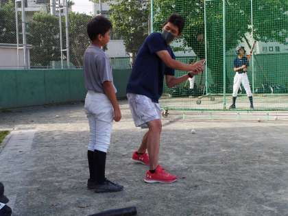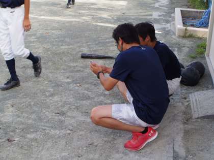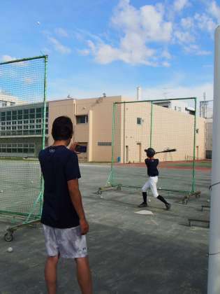 顧問の先生がタブレットで撮影しているのは、打撃フォームのアドバイスのため。生徒と画像でチェックしながら、確認しています。
