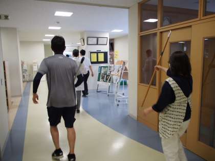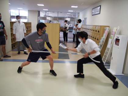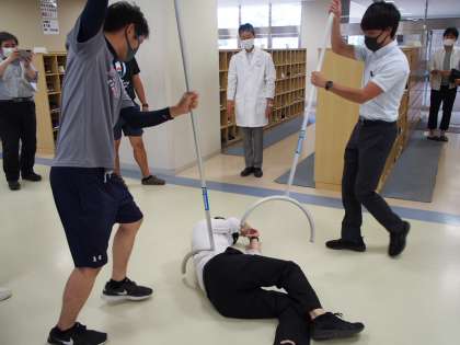 6月に実施した不審者対応訓練の様子です。凶器を持っている相手を押さえるサスマタも校内に配備されています。