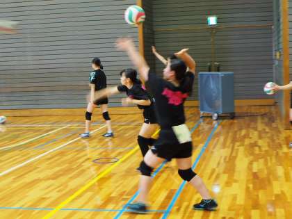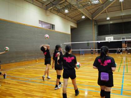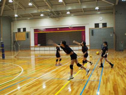 休業期間明け初日、体育館ではバレーボール部が練習をしています。いつもよりも長い休みのあとは、体を動かすと重さを感じることが多いのですが、フナキボバレー部の生徒たちは頑張っています。