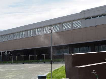 昨日から夏の空が戻ってきました。そこで気になるのが夏の陽射しから身を守ること。部活動の生徒の日陰の場所を確保するため、急遽テントを設置しました。そして、シャワーミスト発声装置。テントの中の生徒用ミストも準備中です。
