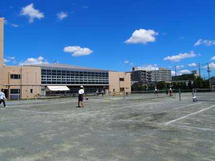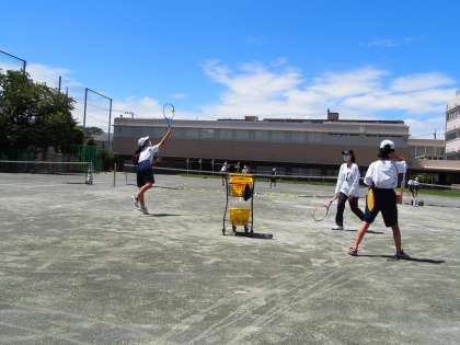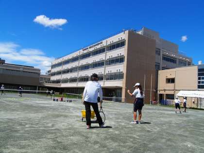 硬式テニス部が夏の青い空のもと、部活動でボールを追っています。青春だなあ。