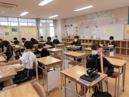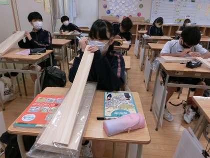 登校している生徒たちは、モニターでの説明をききながら、木材に名前を書いていました。毛塚先生の一つひとつの詳しい説明に、「なるほど」があり面白かったです。そのあとは、ワークにそれぞれ集中して取り組んでいました。 (水巻)