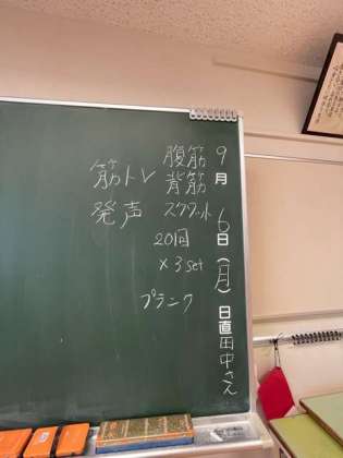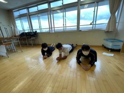 プランクってなに?と聞くと、その場でやってくれました。腕立て伏せの耐久版みたいな感じで結構大変。肺活量を鍛える為にも体力づくりが必要なんですね!(岩崎)