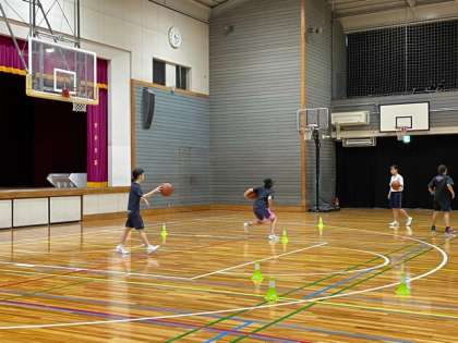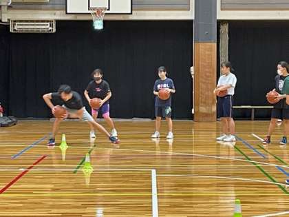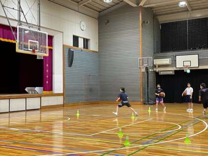 バスケ部では相手をフェイントでかわしてクイックターンからのシュートに持ち込む練習をしていました。ドリブルからクルッと身体を半回転させてボールを回しとるという技。やってみたらスポーンとボールが抜けていってしまいました。手のひらからはみ出る大きなボールを操るのは難しいですね。キュキュッというバッシュの音がカッコいい!(岩崎)