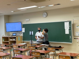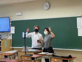 放課後、学年フロアに行くと加我先生と山地先生が明日の配信授業の準備をしていました。カメラに気づくとピースサインで応えてくれました!