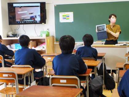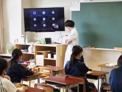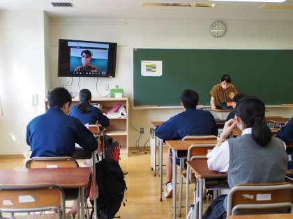 朝の学級活動中の10期生です。今朝は自宅にいる生徒もオンラインで参加しています。画像で参加する生徒もいました。「みんな元気〜?」「クラスのみんなもこんな感じですよ〜」とカメラで登校している生徒の顔を写して配信しました。