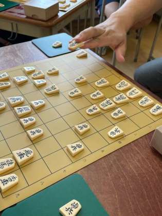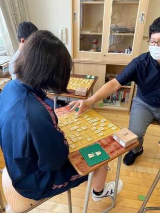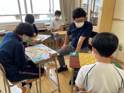 顧問の川野先生が部員4人を相手に将棋を指していました。部員は次の一手を考え川野先生に挑んでいますが、盤面を一瞥しては手を読み、さらにアドバイスをしています。プロ棋士を目指していただけあって、さすがです。駒を指に挟み、パチンッと音を立てて置くところがカッコいい!部員もこの持ち方はバッチリマスター。長考している姿を見ると、もの凄く頭を使うだろうなぁと感心しました。昔は駒の動きも覚えていましたが、今では各駒の制限された動きがわかりません。裏になったら全部1マスしか進めないんだっけ?と考えただけで混乱です。みんな脳が活発に動いているんだろうなぁ。顧問を打ち負かすまで、精進!(岩崎)