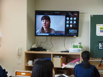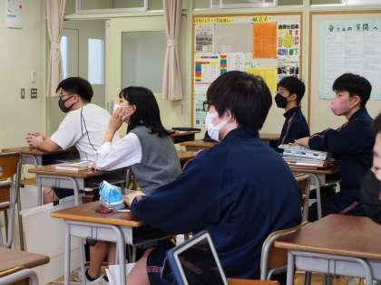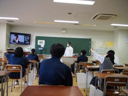 10期生朝の学級活動です。ご家庭の事情で急遽、お休みすることになった担任の先生が自宅から参加しています。オンラインってこういうことができるのですね。もちろん自宅の生徒もこの画像を見ています。教室の生徒は、不思議な感覚をもったのか、画面に見入っていました。