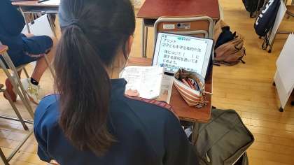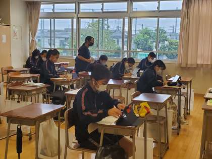 3年生の家庭科の授業です。タブレットを使用して課題に取り組みました。教科の先生も教室に入り、子供たちにアドバイスをしています!