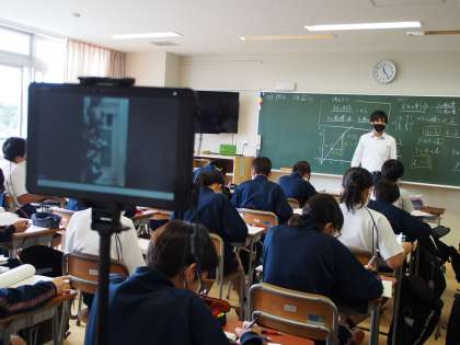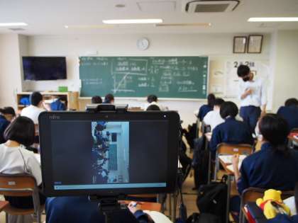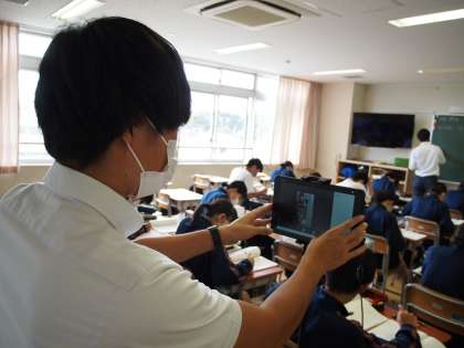 オンラインに参加している生徒のために、授業を撮影中。?でもなぜか、画面が縦に。隣の先生が修正を試みましたが、うまくいかず。やはり、今週から始まったので、このようなトラブルを一つ一つ解決していかなくはなりません。