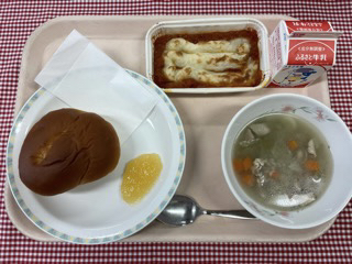 鶏ガラスープとひよこ豆はスコッチブロス(スープ)になりました。大麦も入って食感の良いスープです。今日は手作りりんごジャムもつきました。 (栄養士 高橋)