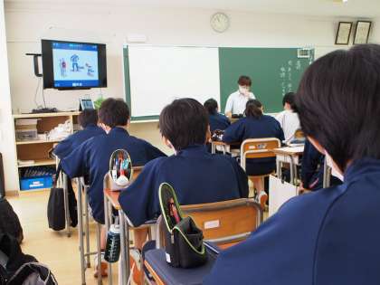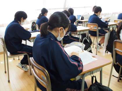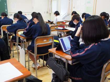 11期生の道徳の授業で「礼儀」について学んでいます。朗読を聞きながら、教科書やロイロノートに送られている文面に神経を傾けています。