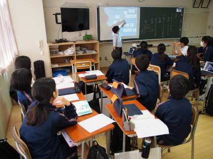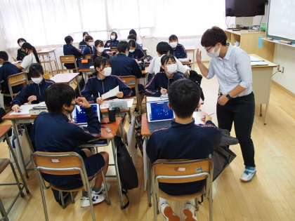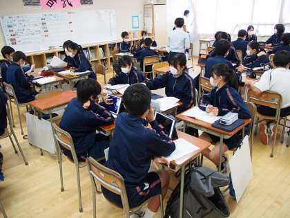 「礼儀にどんな意味があるでしょうか」の話合いも、ディスタンスを取りながら静に、かつ丁寧に進めています。担任の先生はひとつひとつ回って、常によきアドバイスをつたえていました。