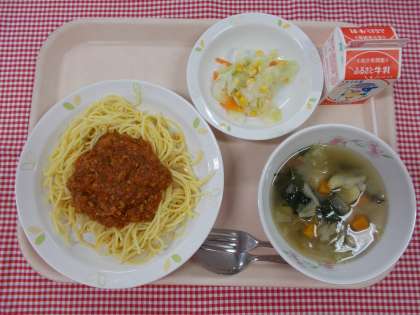 主食は、「スパゲティミートソース」です。みじん切りにした玉ねぎを甘みが出るまでよく炒め、ひき肉と鶏がらスープやトマトピューレなどの10種類の調味料と一緒にじっくりと煮込みました。