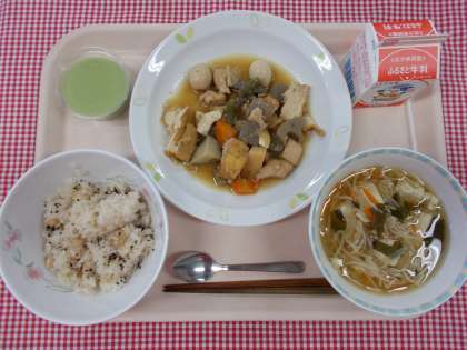 「奈良茶飯」は、奈良の僧たちが食べていた、お茶で炊いた炊き込みご飯です。給食では、ほうじ茶を使って炊きました。