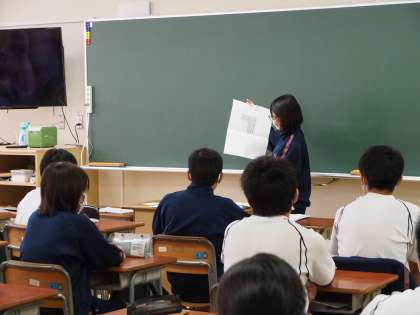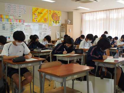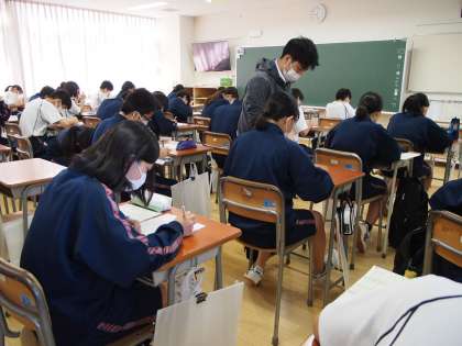 フナキボでは朝からNIEに取り組んでいます。区の施策として、すべての中学校で取り組んでいる社説をまとめる朝学習が今日は11期生で行われています。それに加え、フナキボ独自の取組みが「日直NIE」です。