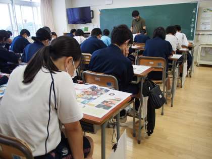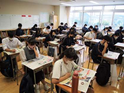 ネットニュース全盛の時代ですが、実はインターネットで伝えるニュースのおおもとはほとんどが新聞社が取材したニュースなのです。生徒が読んでいる中高生新聞。毎週金曜日発行ですが、生徒の昇降口を入ったところにあるNIEコーナーで毎週最新号を手にとることができるのもフナキボならではです。