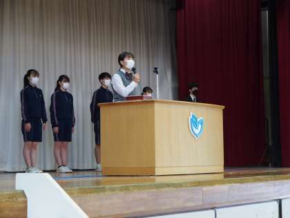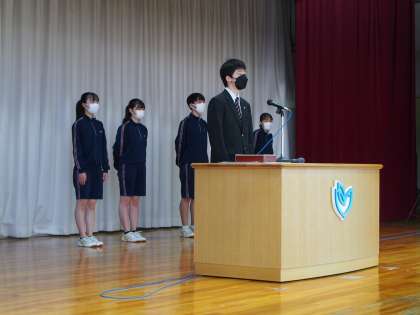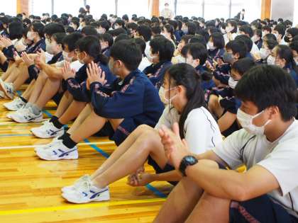 新旧生徒会長からのあいさつの間も、フナキボの生徒の姿勢と顔つきは真剣そのもの。終わったあとの拍手も自然に出ていました。