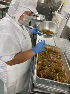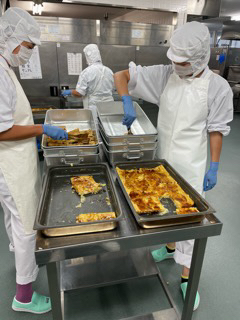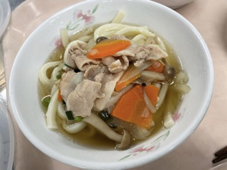 今日は郷土料理の大阪府メニューです。お好み焼きはえびとイカ入りです。肉うどんの汁は、関西風にダシをきかせています。