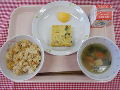 今日、10月18日は、十三夜です。新月から13日目の夜なので十三夜といいます。お月見といえば中秋の名月が有名ですが、日本では十三夜もまた美しい月が見られると大切にされてきました。十五夜か十三夜のどちらかの月だけを見ることは「片見月」と言われ、縁起が悪いという言い伝えがあります。十五夜が「芋名月」と呼ばれるのに対し、十三夜は「栗名月」や「豆名月」と呼ばれます。今日の給食では、秋が旬の食材をたくさん使った「秋の香りごはん」を出しました。栗やさつまいも、しめじ、にんじん、油揚げなど具だくさんのごはんです。味わって食べてください。