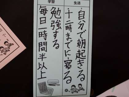教室で授業を撮影していてふと後ろを見ると、今学期の目標が貼ってありました。なるほど、なるほど…。「12時」ですか。あと30分、早く寝られるともっといいのだけれど。「だらしなく、ゴロゴロするのをできるだけやめる」ゴロゴロするのも人生必要ですよ。時間を区切ることが大切です。あっ、でもそれができるのであれば、ここには書いてないか…。