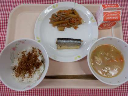 主菜は、秋の魚、さんまの塩焼きです。今日は、さんまの食べ方を意識しながら食べてみましょう。真ん中の骨に沿って切り目を入れて上の身を食べましょう。その後、中骨を外して皿の上に置き、小さい骨に気を付けながら下の身を食べてます。日本語の授業で学んだことを実践してみてくださいね。