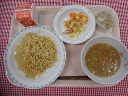 今日の麺は、「つけ麺のみそラーメン」です。麺をスープに浸しながら食べましょう。スープには、白菜やにんじんなどの野菜や豚肉などたくさんの具が入っています。飲み干さなくて良いですが、入っている野菜はしっかりと食べてくださいね。