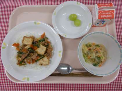 主食は、「家常豆腐丼」です。家常豆腐は、中国で親しまれている家庭料理のひとつで、生揚げを使った野菜の煮物です。「家常」とは、家で日常的に食べられているという意味です。今日の給食では、ごはんの上にかけていただきます。栄養たっぷりでおいしいですよ。