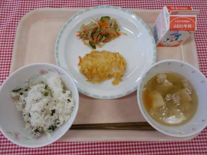 今日の主菜は、「鶏肉のコーンフレーク焼き」です。鶏肉に下味をつけ、オリーブ油とマヨネーズを絡めて、コーンフレーク・パン粉・粉チーズでつくった衣をつけて焼きました。サクサクとした食感を楽しんで食べてください。