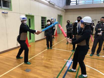 片山先生が簡易的な用具を使用し、隣の中学校の先生と立ち合いました。